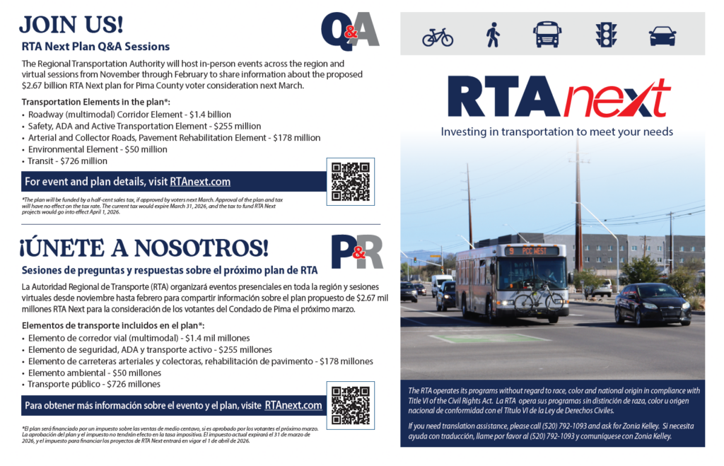 The current RTA plan will expire at the end of June 2026. The Regional Transportation Authority, a state-established taxing district within Pima County, finalized a new 20-year regional transportation plan (RTA Next) to improve the transportation network in the greater Tucson region and enhance our quality of life. The RTA Next plan will be on the ballot March 10, 2026, when voters in Pima County will have the say on the $2.67 billion regional transportation plan for the next 20 years. Since 2004 the RTA collects a half-cent sales tax to fund its current 20-year plan approved by voters in 2006. Voters need to approve the half-cent sales tax to continue funding for another 20 years since the current sales tax will expire in March 31, 2026.